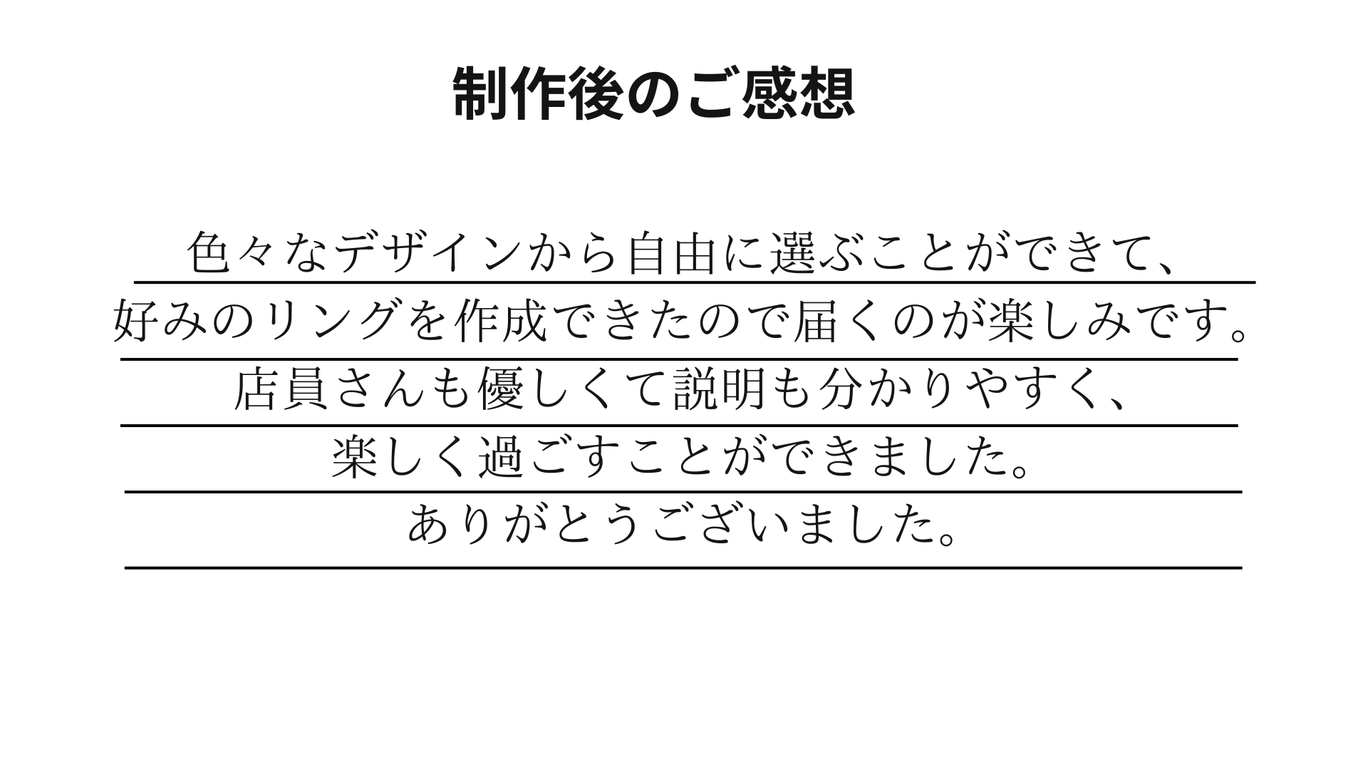 豊富なデザインの中からお好みのリングをお選びいただき、理想の仕上がりを楽しみにお待ちいただいているとのこと、大変嬉しく存じます。