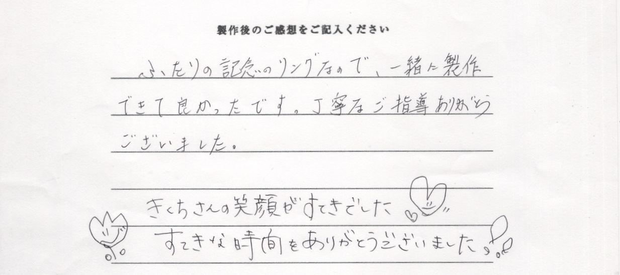 ふたりの記念のリングなので、一緒に制作できて良かったです。丁寧なご指導ありがとうございました。