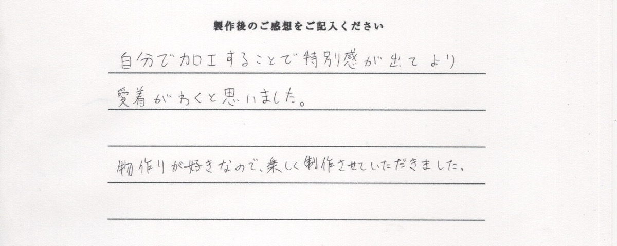 サイズ調整をしっかりされて、ご自身に心地よいサイズに仕上がったようで、嬉しく思います。